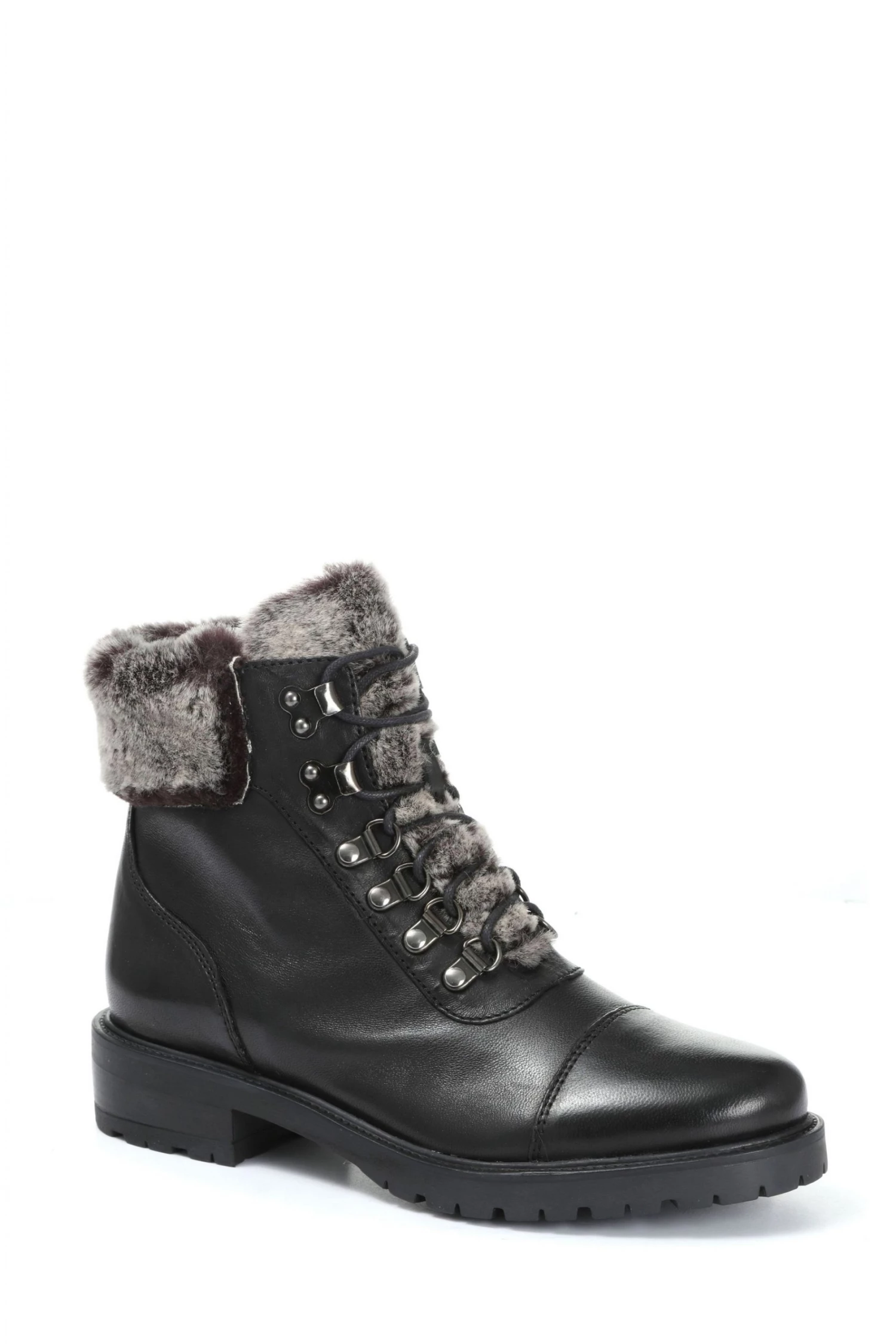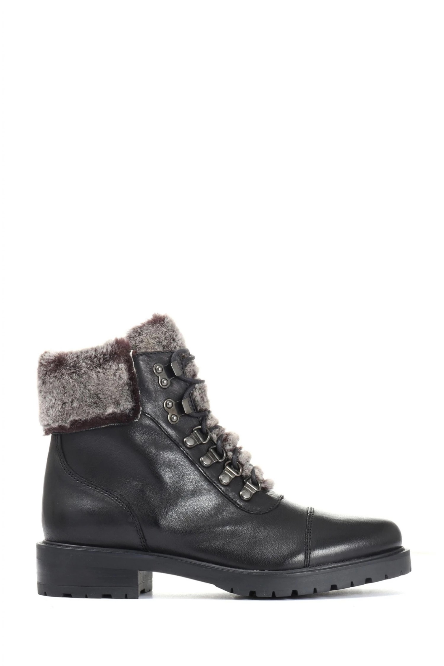 A sophisticated twist on the unstoppable hiker boot trend, the lace-up ankle boot injects a utilitarian edge to their weekend looks. Rendered in smooth, premium leathers and trimmed faux-fur, the lace-up fastening is off-set with almond toe and toe cap, poised on a lightweight commando tread sole.